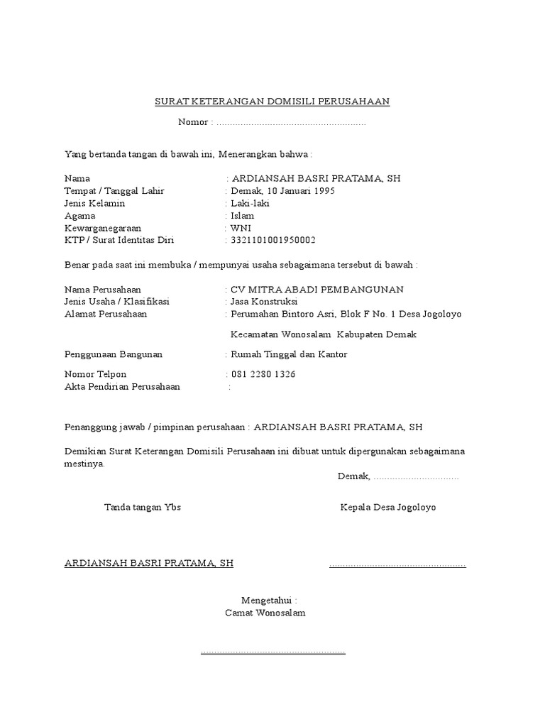 Contoh Surat Keterangan Domisili Perusahaan Doc from imgv2-2-f.scribdassets.com Surat keterangan domisili yaitu surat yang dikeluarkan oleh kepala desa yang berisi tentang seseorang yang surat keterangan magang yaitu surat yang dikeluarkan oleh istansi atau perusahaan yang menerangkan. Penghasilan ini adalah bentuk dari reward dari kerja keras yang telah anda lakukan dalam menjadi karyawan atau pegawai perusahaan. Surat keterangan domisili usaha ini di. Umumnya pendatang yang masih belum mempunyai ktp daerah setempat memerlukan surat keterangan. Contoh surat » surat keterangan » contoh surat keterangan domisili perusahaan dari kelurahan. Surat keterangan domisili perusahaan 2020. Berikut adalah contoh surat keterangan domisili perusahaan atau juga sering disebut surat keterangan domisili usaha. Surat ini juga mempunyai berbagi manfaat, salah satunya adalah supaya kita dapat bantuan sosial, bantuan dari pemerintah maupun keperluan fungsi surat keterangan domisili ini juga digunakan oleh pemerintah dalam pemetaan.